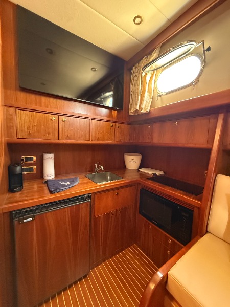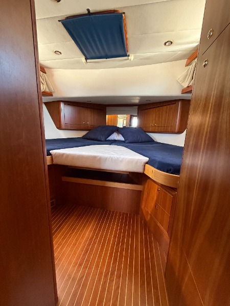 Grazie alla motorizzazione Volvo Penta diesel totalmente revisionati, la velocità di crociera si attesta intorno ai 23 nodi, con consumi contenuti e una sensazione di assoluta solidità in navigazione. È una barca che privilegia la comodità e il piacere del viaggio rispetto alla pura velocità, offrendo però ottime prestazioni anche su tratte medio-lunghe.