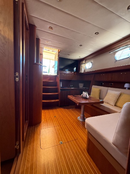 Il layout prevede una spaziosa cabina armatoriale a prua, una cabina ospiti doppia, due bagni completi e una zona living con dinette e cucina attrezzata. Le finiture in legno pregiato, il teak lucido e la tappezzeria artigianale evocano l’atmosfera calda e marina che da sempre contraddistingue le barche Aprea.
