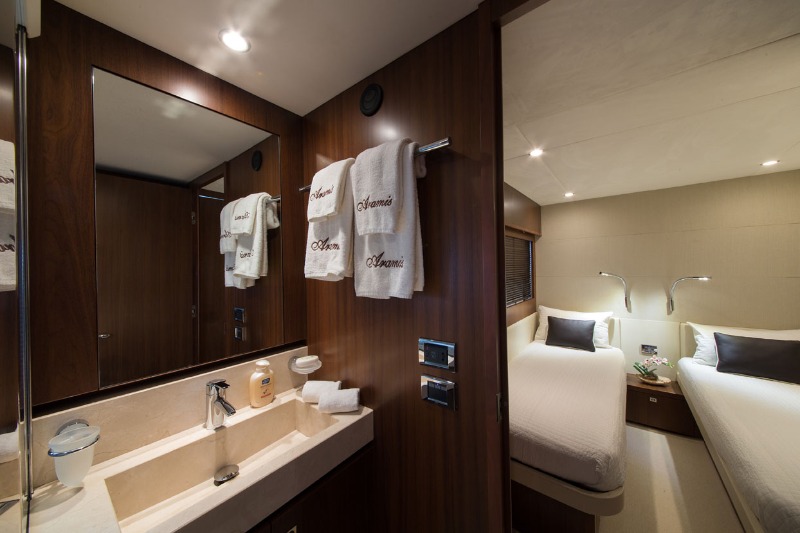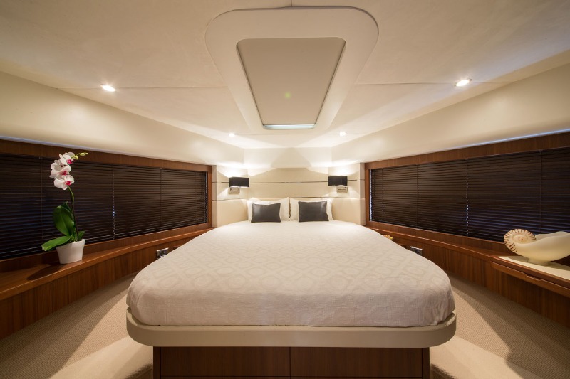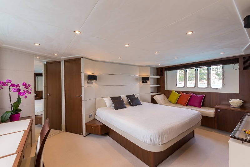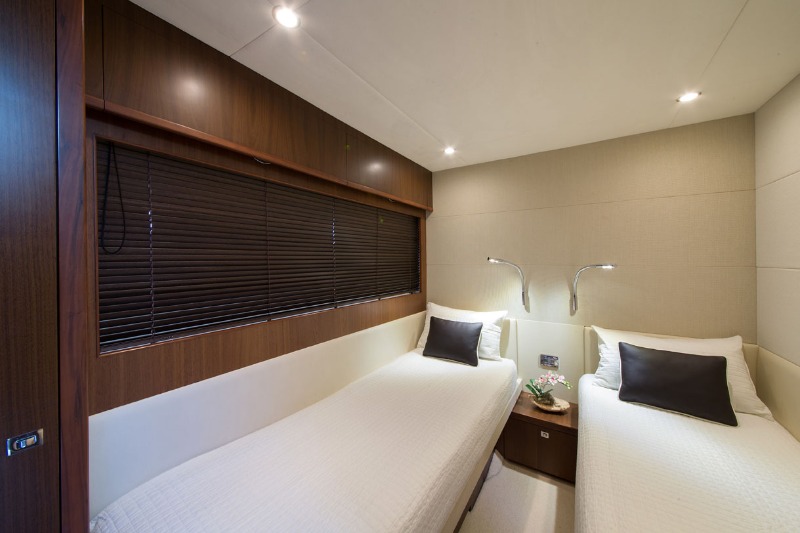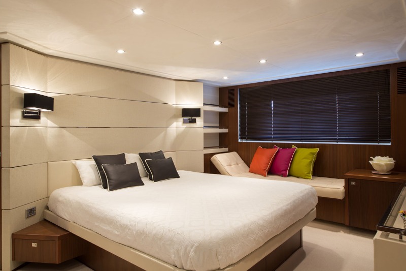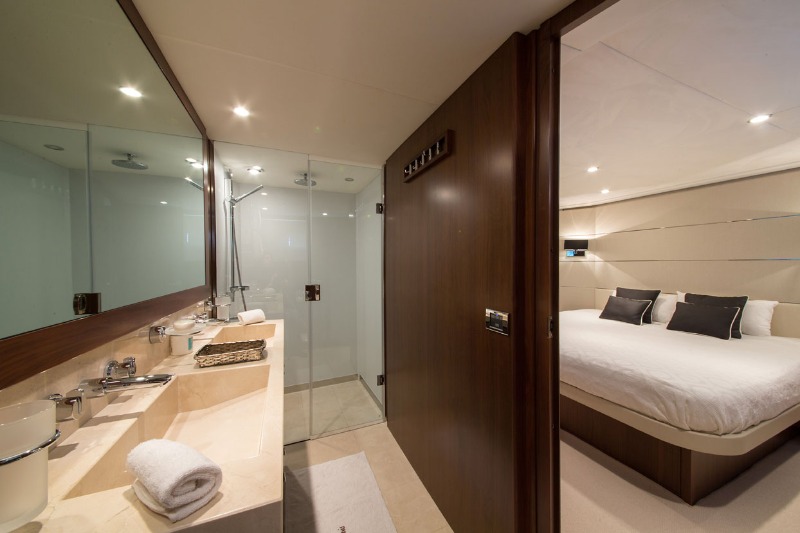 Il Princess V 78 accoglie fino a 8 ospiti in quattro cabine lussuose: una cabina armatoriale full-beam con bagno privato, una cabina VIP a prua e due cabine ospiti laterali. Gli interni, rifiniti in legni pregiati e tessuti di alta gamma, offrono un’atmosfera calda e contemporanea.